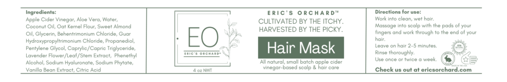 Eric’s curated, small batch Apple Cider Vinegar (ACV)-based hair mask is made with 100% all natural, plant-based, locally sourced and produced ingredients. Complete Ingredient List